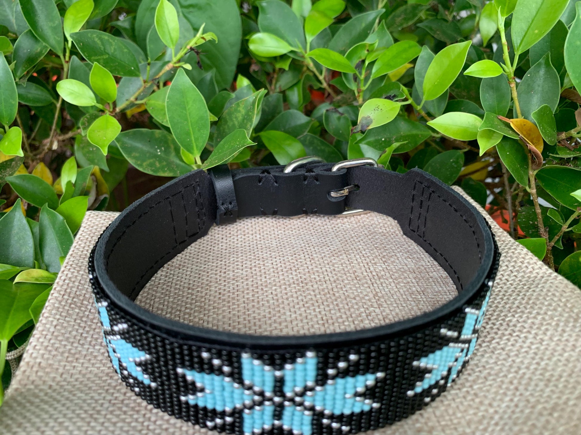 Note: As each collar is handcrafted, slight variations in bead pattern and leather grain make your piece one-of-a-kind.