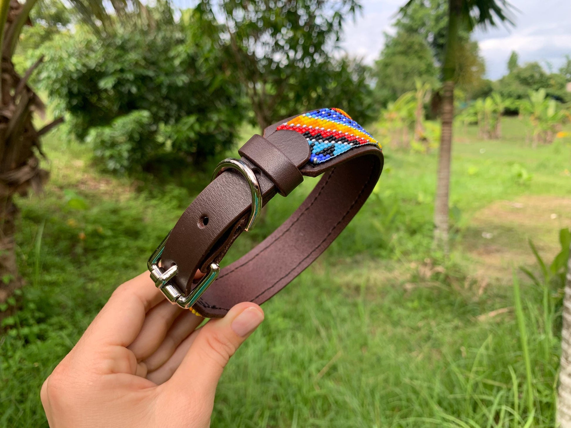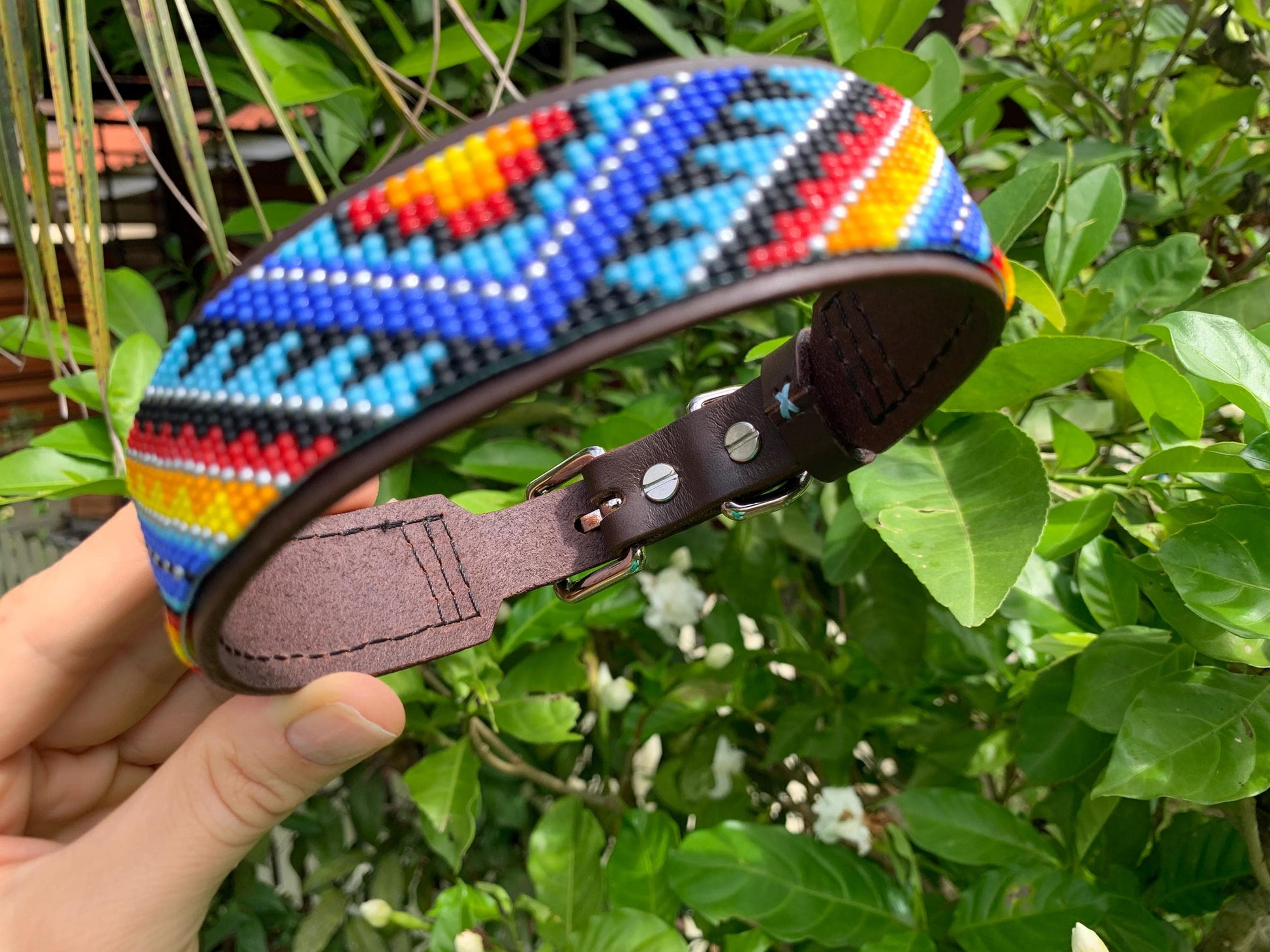 Elevate your pup’s style with our handcrafted leather dog collar, made from premium Italian leather and adorned with high-quality Czech seed beads. This vibrant collar combines durability, elegance, and craftsmanship, making it a perfect accessory for your beloved dog.